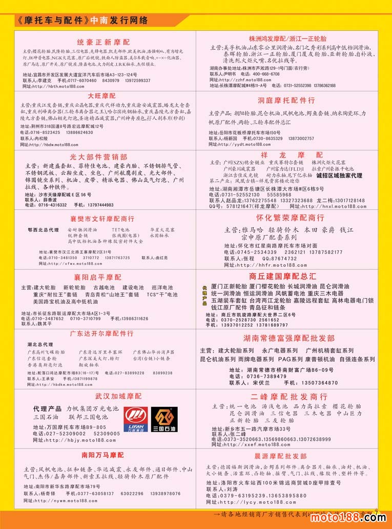 3、《中國摩托車配件生產(chǎn)企業(yè)大全(網(wǎng)址總匯)》第十一次升級版,在會上及各大市場同時發(fā)送。全國大市場還會送書上門,沒參會的企業(yè)可在門上坐等,愿意付郵費(快遞到付也可)的企業(yè)我們都會快遞送達。