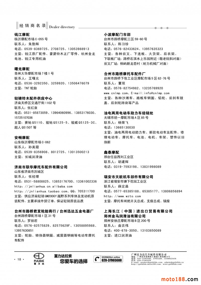 3、《中國摩托車配件生產企業大全(網址總匯)》第十一次升級版,在會上及各大市場同時發送。全國大市場還會送書上門,沒參會的企業可在門上坐等,愿意付郵費(快遞到付也可)的企業我們都會快遞送達。