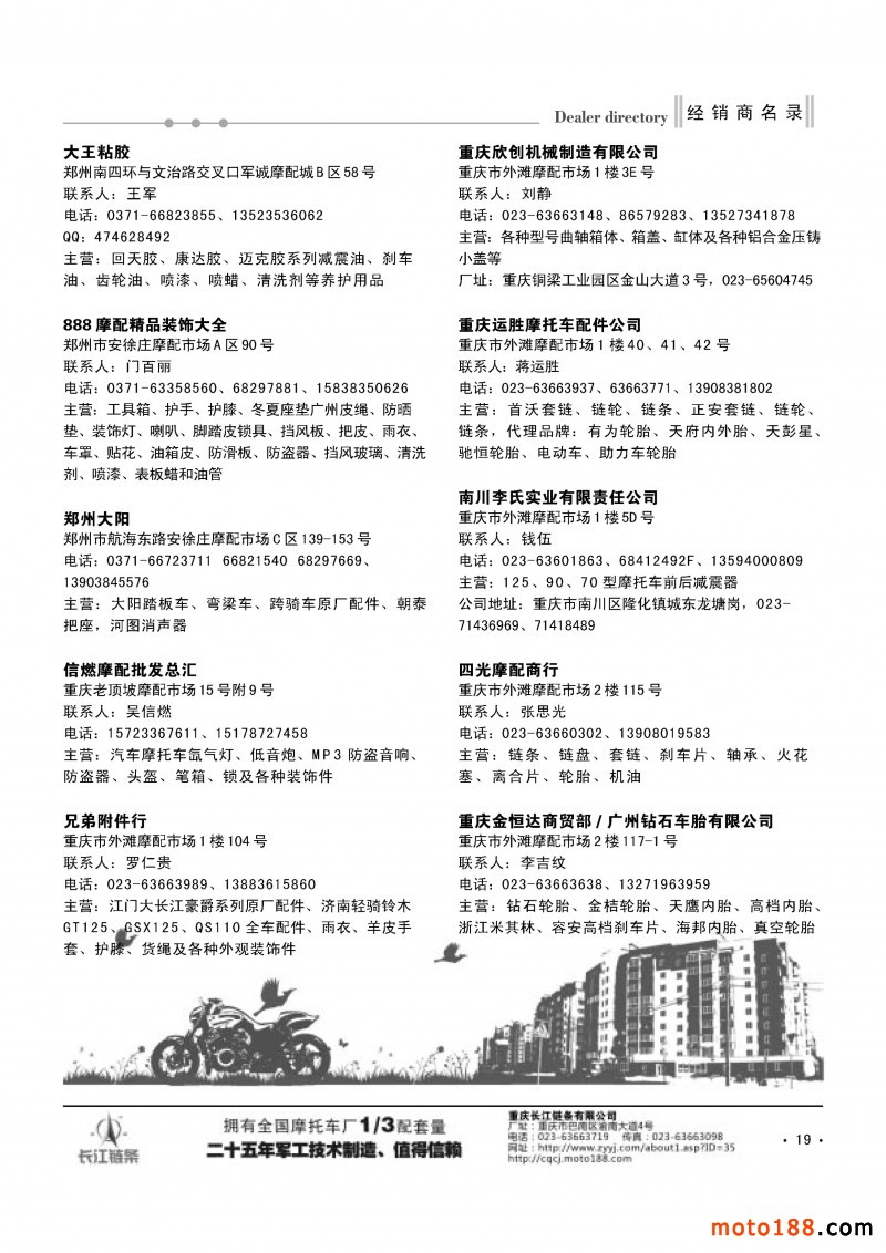 3、《中國摩托車配件生產企業大全(網址總匯)》第十一次升級版,在會上及各大市場同時發送。全國大市場還會送書上門,沒參會的企業可在門上坐等,愿意付郵費(快遞到付也可)的企業我們都會快遞送達。