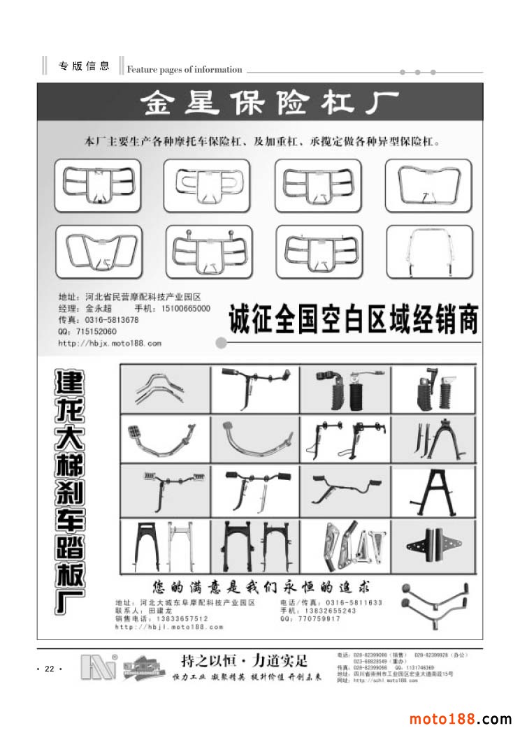 3、《中國摩托車配件生產企業大全(網址總匯)》第十一次升級版,在會上及各大市場同時發送。全國大市場還會送書上門,沒參會的企業可在門上坐等,愿意付郵費(快遞到付也可)的企業我們都會快遞送達。