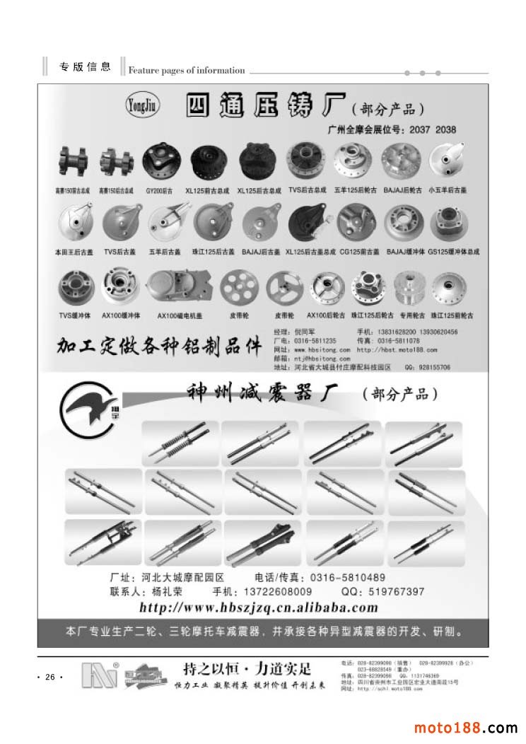 3、《中國摩托車配件生產企業大全(網址總匯)》第十一次升級版,在會上及各大市場同時發送。全國大市場還會送書上門,沒參會的企業可在門上坐等,愿意付郵費(快遞到付也可)的企業我們都會快遞送達。