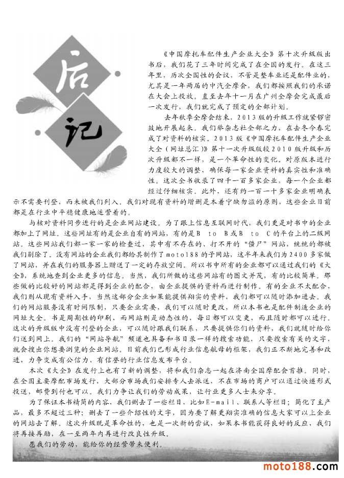 三年發行承諾的履行,并不是意味著我們工作的結束,而是我們為行業服務的又一新開始。從今年下半年開始我們就已在籌劃對《摩托車與配件生產企業大全》進行第十一次的升級,這本書從有償銷售到無償發放的3年,期間我們一直在研究和探索怎樣更全面、更便捷的展示廠家信息。