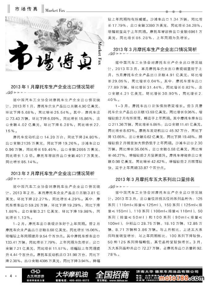 目前行業只有我們是碩果僅存的媒體,全國有七十幾個大大小小的集散市場,和分散在各地市、縣、鎮的幾萬家經營散戶。姑且不算國外市場,就國內摩配行業而言也算是。經過這么多年的調整,都先后轉向了,如果一年出十二期雜志,對于整個摩配行業來說確實是不夠的:周期長、時效性慢,不符合未來市場的需要。當然,這需要一個適應的過程,我們現在決定冬夏季各縮一期,讓節奏適應市場。這兩年來我們雜志每年都有一些調整,來適應市場的變化。不變是相對的,變是永恒的,尤其像《摩托車與配件》在上升和發展時期,更是在探索中前進,在前進中發展。那些倒下的媒體就是因為缺少創新探索精神,墨守成規,與社會發展趨勢漸行漸遠而被時代所淘汰。