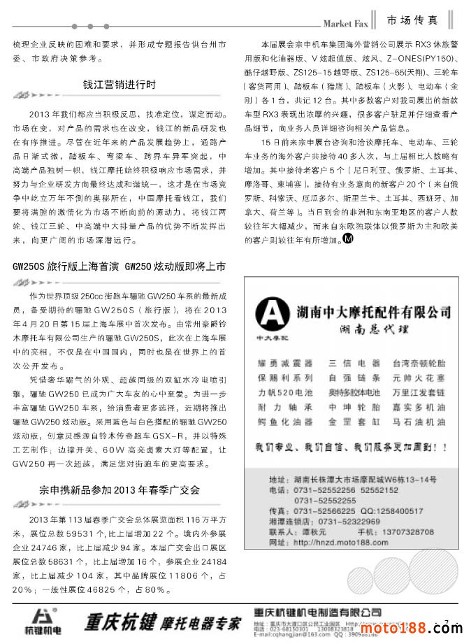 目前行業只有我們是碩果僅存的媒體,全國有七十幾個大大小小的集散市場,和分散在各地市、縣、鎮的幾萬家經營散戶。姑且不算國外市場,就國內摩配行業而言也算是。經過這么多年的調整,都先后轉向了,如果一年出十二期雜志,對于整個摩配行業來說確實是不夠的:周期長、時效性慢,不符合未來市場的需要。當然,這需要一個適應的過程,我們現在決定冬夏季各縮一期,讓節奏適應市場。這兩年來我們雜志每年都有一些調整,來適應市場的變化。不變是相對的,變是永恒的,尤其像《摩托車與配件》在上升和發展時期,更是在探索中前進,在前進中發展。那些倒下的媒體就是因為缺少創新探索精神,墨守成規,與社會發展趨勢漸行漸遠而被時代所淘汰。
