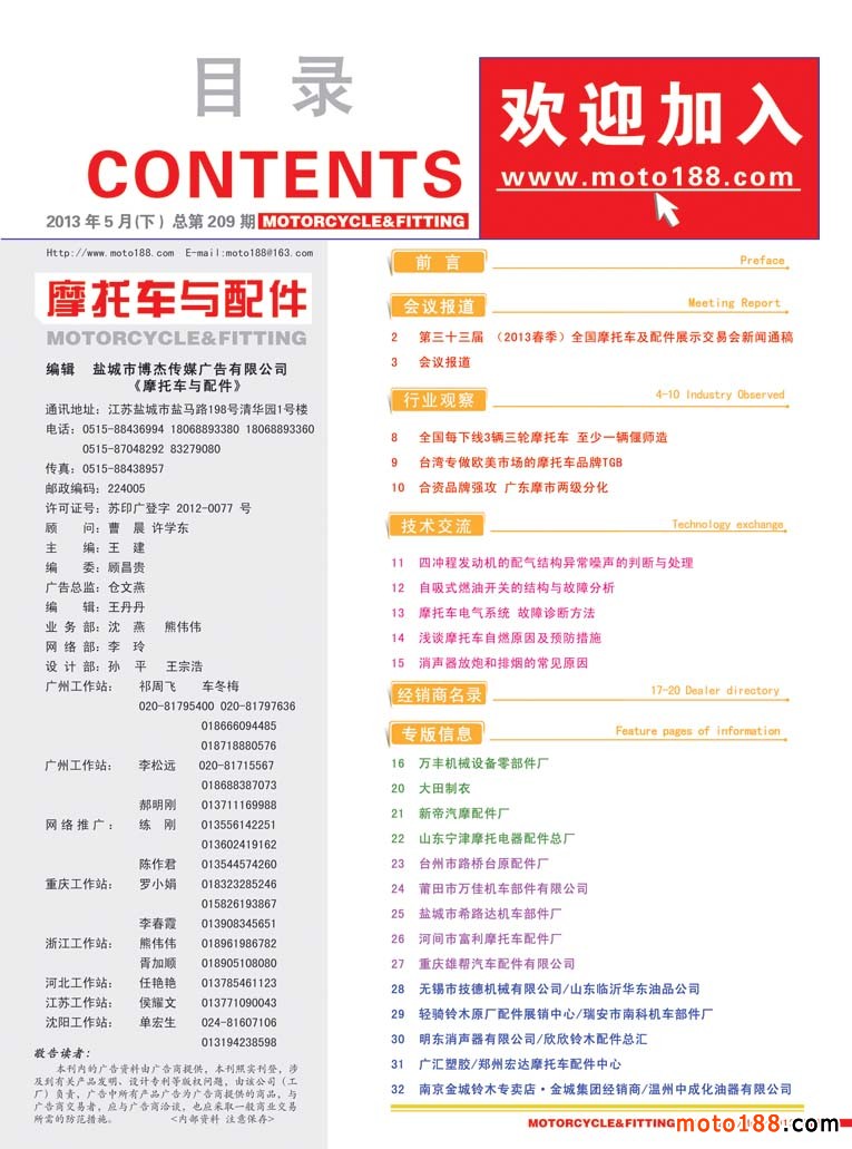 在4月29日全摩會結束之后,也有兩個與行業有關的會議,即5月6日的第23屆中國國際自行車展覽暨2013年中國國際摩托車及零部件交易會在上海新國際展覽中心召開。這次會議是以自行車及配件唱主角,電動車和摩托車作為配角而舉辦的大型會議,這次會議在自行車行業是規模最大的會議。與我們摩托車行業有關的一些從事外貿的整車廠,如建設、錢江等四五家廠家在附展館有一專門展廳。另外,輪胎企業有一個專門的展館,展品是外胎和內胎。其中外胎來的大廠較多,也較全,比如正新、建大、朝陽,國內有影響力的都基本來參會了,是這次會議的亮點。上海會議結束后,我們帶了部分外貿報紙和雜志在上海幾個市場進行了發放,同時走訪了這些市場。自去年上半年,宜川市場拆遷后,在古浪路和滬太路分別形成了兩個市場。我們去了每一家商戶,收集市場客戶資料,為我們今年下半年《華東市場指南》的出版進行準備。這兩個市場都不算大,每一個市場有六七十戶做摩配生意的,有不少商家就是從宜川市場搬來的。還有兩個小市場,科雄和星中路市場,商戶比年初又有減少,市場明顯在萎縮。我們這次的《華東市場指南升級版》原準備將江西不收錄其中,準備和中南地區一起編入,但如果華東市場萎縮輻度較大,江西省還將編入華東地區。