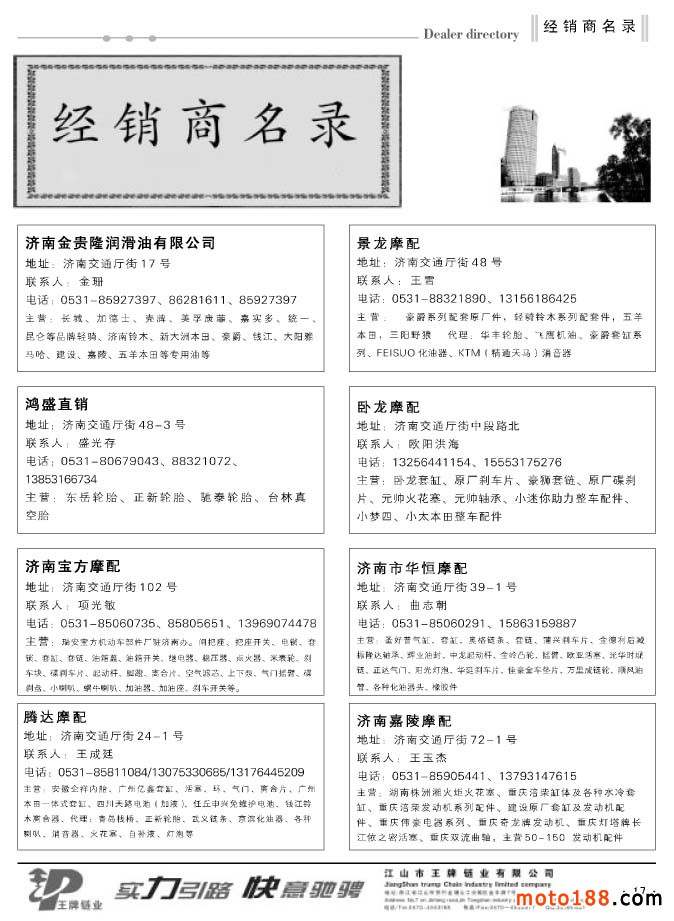 在4月29日全摩會結束之后,也有兩個與行業有關的會議,即5月6日的第23屆中國國際自行車展覽暨2013年中國國際摩托車及零部件交易會在上海新國際展覽中心召開。這次會議是以自行車及配件唱主角,電動車和摩托車作為配角而舉辦的大型會議,這次會議在自行車行業是規模最大的會議。與我們摩托車行業有關的一些從事外貿的整車廠,如建設、錢江等四五家廠家在附展館有一專門展廳。另外,輪胎企業有一個專門的展館,展品是外胎和內胎。其中外胎來的大廠較多,也較全,比如正新、建大、朝陽,國內有影響力的都基本來參會了,是這次會議的亮點。上海會議結束后,我們帶了部分外貿報紙和雜志在上海幾個市場進行了發放,同時走訪了這些市場。自去年上半年,宜川市場拆遷后,在古浪路和滬太路分別形成了兩個市場。我們去了每一家商戶,收集市場客戶資料,為我們今年下半年《華東市場指南》的出版進行準備。這兩個市場都不算大,每一個市場有六七十戶做摩配生意的,有不少商家就是從宜川市場搬來的。還有兩個小市場,科雄和星中路市場,商戶比年初又有減少,市場明顯在萎縮。我們這次的《華東市場指南升級版》原準備將江西不收錄其中,準備和中南地區一起編入,但如果華東市場萎縮輻度較大,江西省還將編入華東地區。