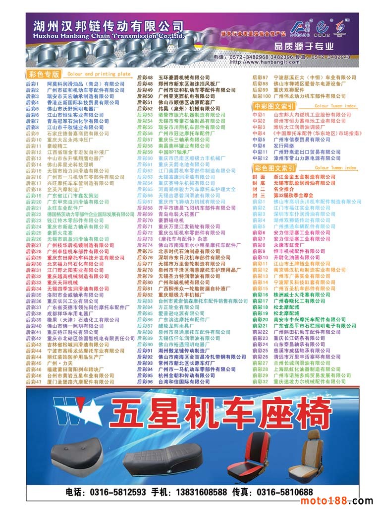 在這個淡季里,我們還將去西北和東北送書、送報上萬,走訪調研這些地區的市場。再次強調,我們送的書是今年上半年在濟南全摩會首發的新版《中國摩托車配件生產企業大全》,送的報紙是《摩托車與配件外貿報》。我們的雜志還是由全國各發行點直接發放給市場上的經營商戶。目前《大全》已完成在山東、河北、廣東和重慶等省市的主要市場的發行。今年年底之前完成對全國市場的投放。