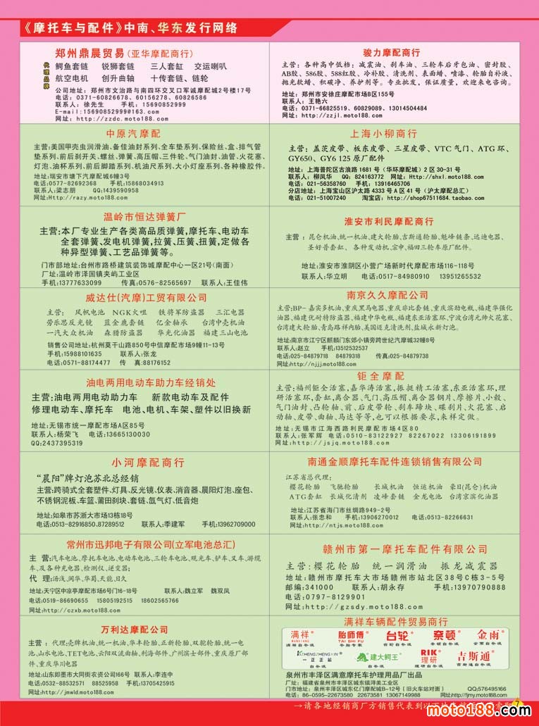 經過幾次改刊后的發行情況來看,我們這種根據市場變化靈活出刊的形式逐步被企業所認可。在發行上我們也是沒有打折扣,月出刊兩期后,黑白的內容要比過去豐富得多,可讀性也在增強。六月變單期后,我們另增加8頁黑白的文字信息內容,黑白每期為40頁。由于北方市場和南方市場淡旺季同期相反,所以在南方的淡季里,我們雜志在北方市場的發行數量將增加。不管南北市場淡旺不同,對我們來說,我們仍將一如既往地做好我們的工作。從今年6月份開始,我們工作人員將分別去福建、浙江、安徽和江西四省,走訪調研這四省的摩配市場,并將派送上萬份《外貿報》和工具書《配件生產企業大全》。同時,我們還將收集市場的最新資料,為下半年的《華東市場指南》做出書的準備工作。目前這項工作進展順利,廣告征集也在穩步進行。完成這些省份的調研工作,我們的信息采集工作也就到了收官階段。工作進展快的話,我們就會提前結束這本書的編排。在10月24日的南京全摩會上,大家就可以看到這本書了。