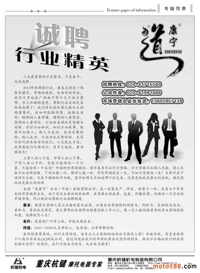 經過幾次改刊后的發行情況來看,我們這種根據市場變化靈活出刊的形式逐步被企業所認可。在發行上我們也是沒有打折扣,月出刊兩期后,黑白的內容要比過去豐富得多,可讀性也在增強。六月變單期后,我們另增加8頁黑白的文字信息內容,黑白每期為40頁。由于北方市場和南方市場淡旺季同期相反,所以在南方的淡季里,我們雜志在北方市場的發行數量將增加。不管南北市場淡旺不同,對我們來說,我們仍將一如既往地做好我們的工作。從今年6月份開始,我們工作人員將分別去福建、浙江、安徽和江西四省,走訪調研這四省的摩配市場,并將派送上萬份《外貿報》和工具書《配件生產企業大全》。同時,我們還將收集市場的最新資料,為下半年的《華東市場指南》做出書的準備工作。目前這項工作進展順利,廣告征集也在穩步進行。完成這些省份的調研工作,我們的信息采集工作也就到了收官階段。工作進展快的話,我們就會提前結束這本書的編排。在10月24日的南京全摩會上,大家就可以看到這本書了。