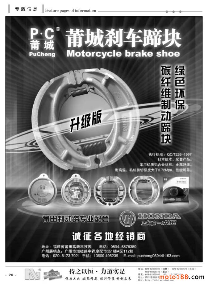 在這個(gè)淡季里,我們還將去西北和東北送書、送報(bào)上萬,走訪調(diào)研這些地區(qū)的市場。再次強(qiáng)調(diào),我們送的書是今年上半年在濟(jì)南全摩會(huì)首發(fā)的新版《中國摩托車配件生產(chǎn)企業(yè)大全》,送的報(bào)紙是《摩托車與配件外貿(mào)報(bào)》。我們的雜志還是由全國各發(fā)行點(diǎn)直接發(fā)放給市場上的經(jīng)營商戶。目前《大全》已完成在山東、河北、廣東和重慶等省市的主要市場的發(fā)行。今年年底之前完成對(duì)全國市場的投放。