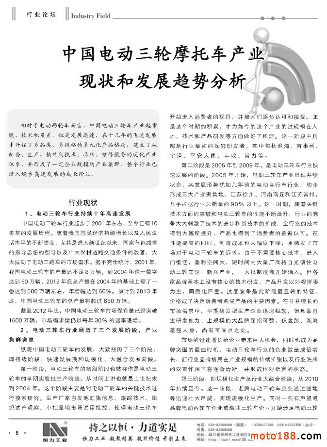 繼上期雜志我們做了小型通機的專題資訊報道之后,市場反映很好,這一期我們做了三輪摩托車的專題。三輪摩托車是今年摩托車市場的亮點,在二輪車市場整體下滑的狀況下,今年三輪摩托車依然逆勢增長。從現(xiàn)有統(tǒng)計數(shù)據(jù)看,今年增長幅度大約在13%左右,總產(chǎn)量將超過500萬輛。目前已經(jīng)形成以河南、重慶、廣東、山東等主要產(chǎn)區(qū),江蘇的淮海宗申是全行業(yè)最大的三輪車制造企業(yè),今年產(chǎn)銷量竟達到70多萬輛。目前三輪車市場正是黃金年代,我們的配件制造企業(yè)有許多配件和三輪摩托車是相同的,大家不妨關(guān)注這個新興的面向廣闊農(nóng)村的市場。這些新的產(chǎn)業(yè)帶需要新的配套鏈,愿你們也成為這個產(chǎn)業(yè)鏈上的鏈節(jié),對從事摩托車配件產(chǎn)業(yè)的企業(yè)來說,這也是一個新的商機。今年我們?nèi)チ嗽S多市場,有些地方已經(jīng)形成了單獨的三輪車市場,一般摩配市場也增加了三輪車配件經(jīng)營的門市,摩托車業(yè)不僅要向深度進軍,也要橫向地向?qū)挾劝l(fā)展。作為輿論導(dǎo)向的媒體,我們也要向行業(yè)輸送正能量,為企業(yè)生產(chǎn)和經(jīng)營出謀劃策。我們通過組織系列的資訊,讓企業(yè)能對新興的產(chǎn)業(yè)有個大致地了解,為企業(yè)的決策起到參謀作用。我們真誠地希望,摩托車業(yè)的所有企業(yè)都能在這個行業(yè)健康有序地發(fā)展成長,共同壯大。