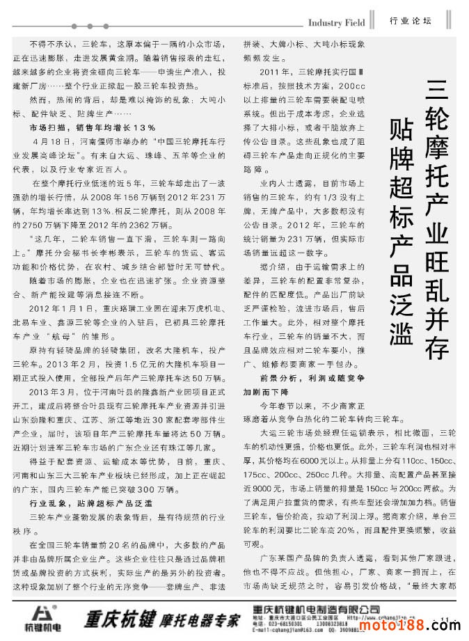繼上期雜志我們做了小型通機的專題資訊報道之后,市場反映很好,這一期我們做了三輪摩托車的專題。三輪摩托車是今年摩托車市場的亮點,在二輪車市場整體下滑的狀況下,今年三輪摩托車依然逆勢增長。從現有統計數據看,今年增長幅度大約在13%左右,總產量將超過500萬輛。目前已經形成以河南、重慶、廣東、山東等主要產區,江蘇的淮海宗申是全行業最大的三輪車制造企業,今年產銷量竟達到70多萬輛。目前三輪車市場正是黃金年代,我們的配件制造企業有許多配件和三輪摩托車是相同的,大家不妨關注這個新興的面向廣闊農村的市場。這些新的產業帶需要新的配套鏈,愿你們也成為這個產業鏈上的鏈節,對從事摩托車配件產業的企業來說,這也是一個新的商機。今年我們去了許多市場,有些地方已經形成了單獨的三輪車市場,一般摩配市場也增加了三輪車配件經營的門市,摩托車業不僅要向深度進軍,也要橫向地向寬度發展。作為輿論導向的媒體,我們也要向行業輸送正能量,為企業生產和經營出謀劃策。我們通過組織系列的資訊,讓企業能對新興的產業有個大致地了解,為企業的決策起到參謀作用。我們真誠地希望,摩托車業的所有企業都能在這個行業健康有序地發展成長,共同壯大。