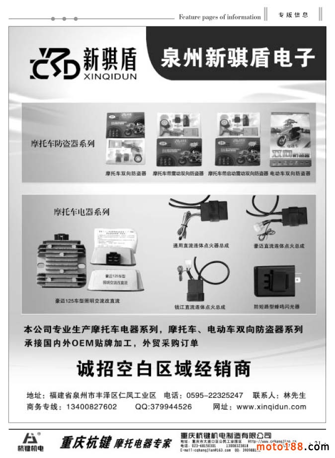 同時還有今年新編的第四期《中國摩托車配件外貿報》,本報除在省會市場發行之外,在廣州和重慶的市場都設有報架,讓客戶隨手取閱。本次報紙和雜志將會一起派送。今年的全摩會《會刊》仍然由中汽組委會派發,在進門口領參展證的同時,領取《會刊》,我們只負責制作,組委會負責發行。
