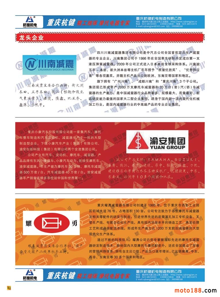 和這些歷經風雨在摩配行業堅守的同仁們一樣,我們也煉得自信與從容。新的一年我們雜志以全新的面貌出現,我們采用全彩色出刊,同時將我們的服務對象橫向延伸。與我們的同仁一樣,立足摩配,橫向拓展,內外兼修,努力做好雜志,除了提升外觀品相,更是注重在內容上的變化。每期雜志用十頁左右的文字來廣角掃描我們摩托車配件行業的子行業,這一期推出的是減震器專題。上一期化油器專題出刊以后,不光受到市場的歡迎,有些企業還把我們的雜志認真地收藏保存好,因為有不少信息對于他們的生產、經營都有一定幫助。對我們來說也是迫使我們更深入地了解摩配的各個子行業。自從前年摩托車行業開始強制提高排放標準以后,我們片面地認為化油器這個行業會被電噴完全取代,這個產業是不是已經步入到夕陽期?通過編排我們較深刻的對這一產業有所了解,制造之地一派欣欣向榮的景象,在我們摩托車業需求量減少之時,我們的制造廠已經在通機領域干得風生水起,有不少廠即使擴大產能也供不應求。當地地方政府也從這個產業得到許多實惠,一個雙贏的局面,這就是產業的正能量。其實市場如何變幻,總有一批做得好的龍頭企業在努力工作,打造自己的名牌,眼光不僅僅局限面前,更多地瞄準了國際市場。中國制造能漂洋過海,被國外消費者所接受,正是這樣一批行業精英為國家和民族在努力。