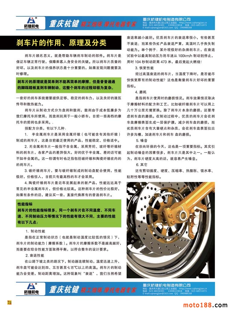 繼2013年12期開始全彩色出刊,再加上每期一個專題的配件子行業的廣角介紹,我們積累了一定的經驗,也有信心做好全部子行業的介紹。目前摩托車分為六大部件,每一大部件又細分為十幾二十幾不少的子部件,和摩托車有關的附件也可另算為一大類,因而我們要想全方位做完各個子行業,就需要有幾年的時間。經過這三期的編排,使我們進一步加深對摩托車配件行業的了解,這一期剎車蹄塊我們本來認為這個子行業報道的題材和內容有限,但我們把資料匯總以后,原來這些行業也別有洞天,后來我們不得不壓縮了題材,精選了內容,還是排了十幾張紙;再加上我們又涉及到三輪摩托車、電動摩托車,沒想到就連小型通機也要用蹄塊制動。
