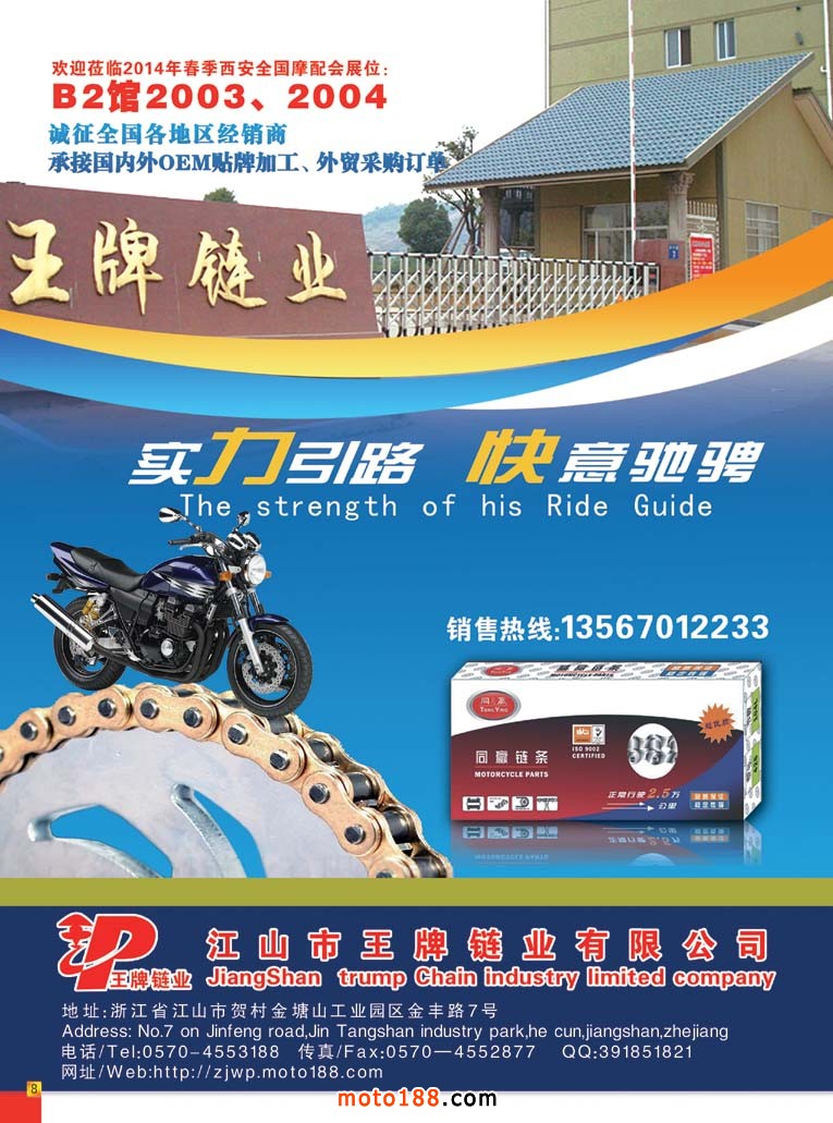 今年我們的雜志還涉及了三輪摩托車、電動摩托車和小型通機三個關連行業,在我們www.zjsoxnet.com網站上鏈接了三輪摩托車:sl .moto189com;電動摩托車dd .moto189.com;小型通機tj .moto189.com。前邊兩個字母分別是前兩個字的聲母很容易記住,大家有空可以去瀏覽。今年下半年我們將加大力量做好這三個網站,再往里面裝填更多內容,爭取用一到二年時間,像我們 www.zjsoxnet.com一樣成為行業的大型網站。