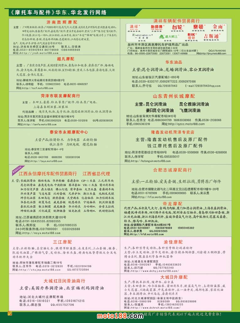 今年我們的雜志還涉及了三輪摩托車、電動摩托車和小型通機三個關連行業,在我們www.zjsoxnet.com網站上鏈接了三輪摩托車:sl .moto189com;電動摩托車dd .moto189.com;小型通機tj .moto189.com。前邊兩個字母分別是前兩個字的聲母很容易記住,大家有空可以去瀏覽。今年下半年我們將加大力量做好這三個網站,再往里面裝填更多內容,爭取用一到二年時間,像我們 www.zjsoxnet.com一樣成為行業的大型網站。
