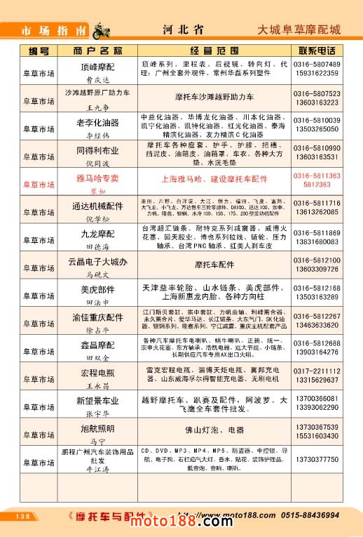 歷時半年,橫跨十三省市的《北方市場指南》今天終于成書,奉獻給行業企業,這本書是我們《中國摩托車配件市場指南》的第三個分冊,也是工作量和難度最大的一本書,為了資料的準確,我們雜志社全體內部工作人員,在炎熱的夏季里,孜孜不倦地工作,先后冒著酷暑兵分三 路去西北、華北、東北的省份,由于夏季暑運高峰,交通也十分不便,有時為了趕路,甚至乘了三十多個小時無空調的大巴車。今天看到這本混合我們汗水和心血的《北方市場指南》我們感覺這份果實更加不同尋常,彌加珍貴。