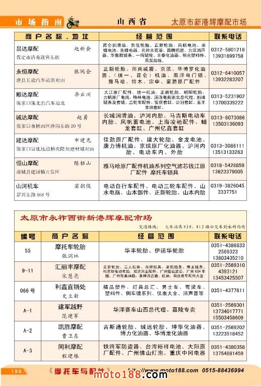 下版為《中國(guó)摩托車配件·西南市場(chǎng)指南》,包括重慶、云南、貴州、四川及陜西省四省一市地區(qū),收錄二千二百多家配件銷售企業(yè)匯總成書(shū),本書(shū)所有資料將是我刊在2011年冬及2012年春收集匯總更新整理的最新最準(zhǔn)確的市場(chǎng)第一手資料。