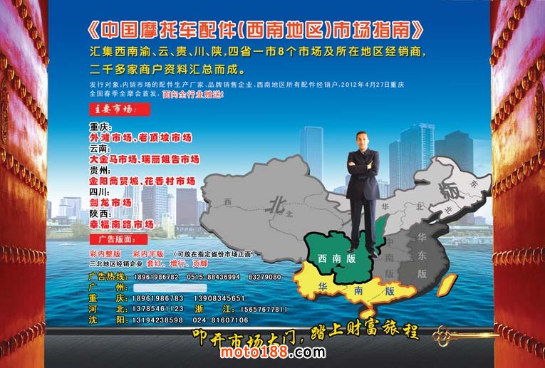 2012年春,行業(yè)最具影響力的“春季全摩會”4月27日在重慶召開,我們將在特殊的時間,特 殊的地域,特殊的市場,推出獨具特色的《中國摩托車配件·西南市場指南》,為您的經(jīng)營提供方向,為您的騰飛插上翅膀。