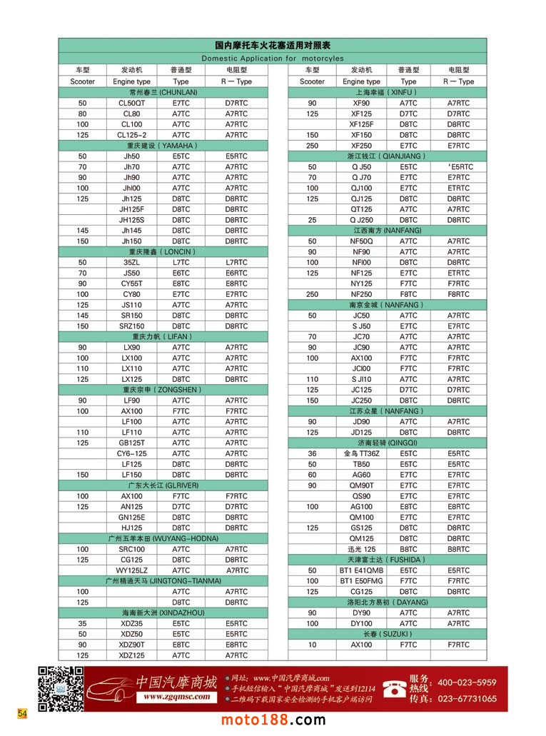 內(nèi)54 國內(nèi)摩托車火花塞適用對照表
