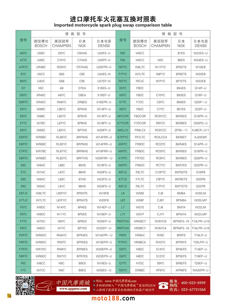 內58 進口摩托車火花塞互換對照表