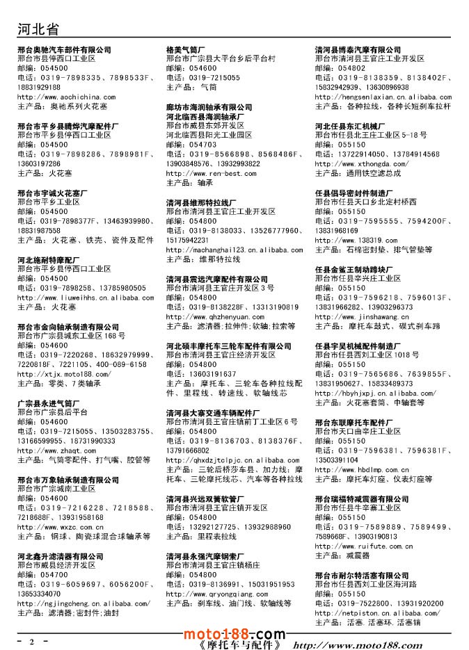 這兩年行業(yè)調(diào)整力度非常大,為了確保我們提供的信息準確性,我們本著寧缺毋濫的原則,不去圖虛的數(shù)量。目前摩托車與配件行業(yè)的不少經(jīng)銷商是跨行業(yè)經(jīng)營的,所以我們在本書中增加了部分摩托車整車廠、電動車生產(chǎn)廠、機動三輪車制造廠。所選的這些企業(yè)都是這個行業(yè)具有影響力的品牌企業(yè),是為了大家在使用這本書時,獲取相關(guān)的延伸產(chǎn)業(yè)更多的實用信息。