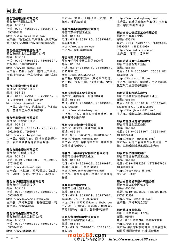 這兩年行業調整力度非常大,為了確保我們提供的信息準確性,我們本著寧缺毋濫的原則,不去圖虛的數量。目前摩托車與配件行業的不少經銷商是跨行業經營的,所以我們在本書中增加了部分摩托車整車廠、電動車生產廠、機動三輪車制造廠。所選的這些企業都是這個行業具有影響力的品牌企業,是為了大家在使用這本書時,獲取相關的延伸產業更多的實用信息。