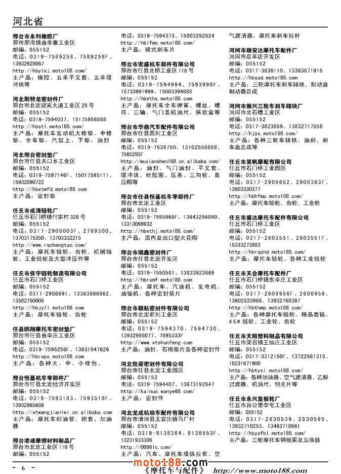 這兩年行業調整力度非常大,為了確保我們提供的信息準確性,我們本著寧缺毋濫的原則,不去圖虛的數量。目前摩托車與配件行業的不少經銷商是跨行業經營的,所以我們在本書中增加了部分摩托車整車廠、電動車生產廠、機動三輪車制造廠。所選的這些企業都是這個行業具有影響力的品牌企業,是為了大家在使用這本書時,獲取相關的延伸產業更多的實用信息。