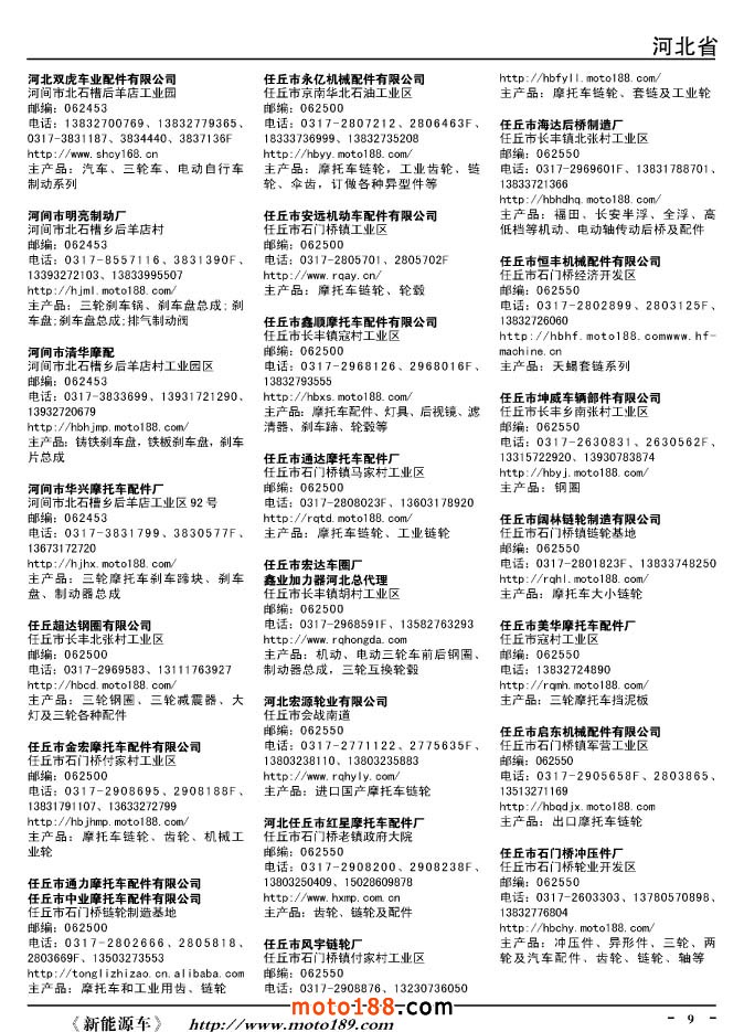 這兩年行業(yè)調整力度非常大,為了確保我們提供的信息準確性,我們本著寧缺毋濫的原則,不去圖虛的數(shù)量。目前摩托車與配件行業(yè)的不少經銷商是跨行業(yè)經營的,所以我們在本書中增加了部分摩托車整車廠、電動車生產廠、機動三輪車制造廠。所選的這些企業(yè)都是這個行業(yè)具有影響力的品牌企業(yè),是為了大家在使用這本書時,獲取相關的延伸產業(yè)更多的實用信息。