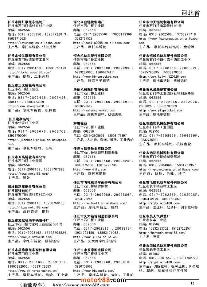 這兩年行業(yè)調(diào)整力度非常大,為了確保我們提供的信息準確性,我們本著寧缺毋濫的原則,不去圖虛的數(shù)量。目前摩托車與配件行業(yè)的不少經(jīng)銷商是跨行業(yè)經(jīng)營的,所以我們在本書中增加了部分摩托車整車廠、電動車生產(chǎn)廠、機動三輪車制造廠。所選的這些企業(yè)都是這個行業(yè)具有影響力的品牌企業(yè),是為了大家在使用這本書時,獲取相關(guān)的延伸產(chǎn)業(yè)更多的實用信息。