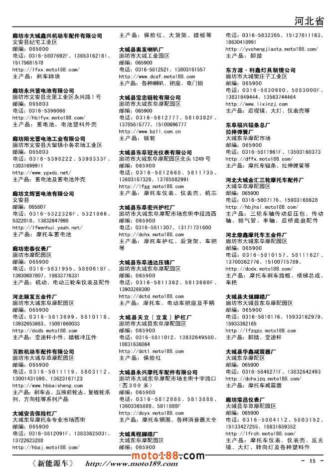 這兩年行業調整力度非常大,為了確保我們提供的信息準確性,我們本著寧缺毋濫的原則,不去圖虛的數量。目前摩托車與配件行業的不少經銷商是跨行業經營的,所以我們在本書中增加了部分摩托車整車廠、電動車生產廠、機動三輪車制造廠。所選的這些企業都是這個行業具有影響力的品牌企業,是為了大家在使用這本書時,獲取相關的延伸產業更多的實用信息。