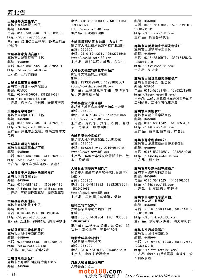 這兩年行業調整力度非常大,為了確保我們提供的信息準確性,我們本著寧缺毋濫的原則,不去圖虛的數量。目前摩托車與配件行業的不少經銷商是跨行業經營的,所以我們在本書中增加了部分摩托車整車廠、電動車生產廠、機動三輪車制造廠。所選的這些企業都是這個行業具有影響力的品牌企業,是為了大家在使用這本書時,獲取相關的延伸產業更多的實用信息。