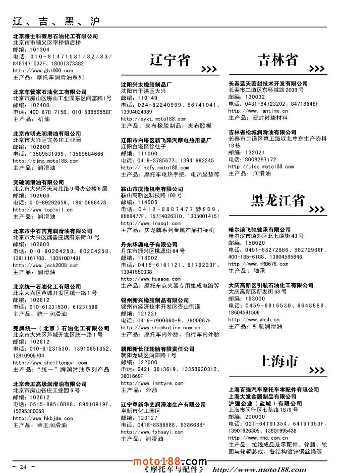 這兩年行業調整力度非常大,為了確保我們提供的信息準確性,我們本著寧缺毋濫的原則,不去圖虛的數量。目前摩托車與配件行業的不少經銷商是跨行業經營的,所以我們在本書中增加了部分摩托車整車廠、電動車生產廠、機動三輪車制造廠。所選的這些企業都是這個行業具有影響力的品牌企業,是為了大家在使用這本書時,獲取相關的延伸產業更多的實用信息。