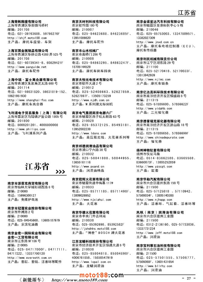 這兩年行業調整力度非常大,為了確保我們提供的信息準確性,我們本著寧缺毋濫的原則,不去圖虛的數量。目前摩托車與配件行業的不少經銷商是跨行業經營的,所以我們在本書中增加了部分摩托車整車廠、電動車生產廠、機動三輪車制造廠。所選的這些企業都是這個行業具有影響力的品牌企業,是為了大家在使用這本書時,獲取相關的延伸產業更多的實用信息。
