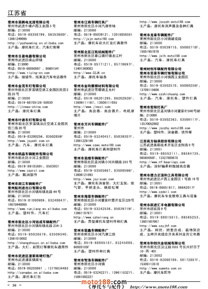 這兩年行業調整力度非常大,為了確保我們提供的信息準確性,我們本著寧缺毋濫的原則,不去圖虛的數量。目前摩托車與配件行業的不少經銷商是跨行業經營的,所以我們在本書中增加了部分摩托車整車廠、電動車生產廠、機動三輪車制造廠。所選的這些企業都是這個行業具有影響力的品牌企業,是為了大家在使用這本書時,獲取相關的延伸產業更多的實用信息。