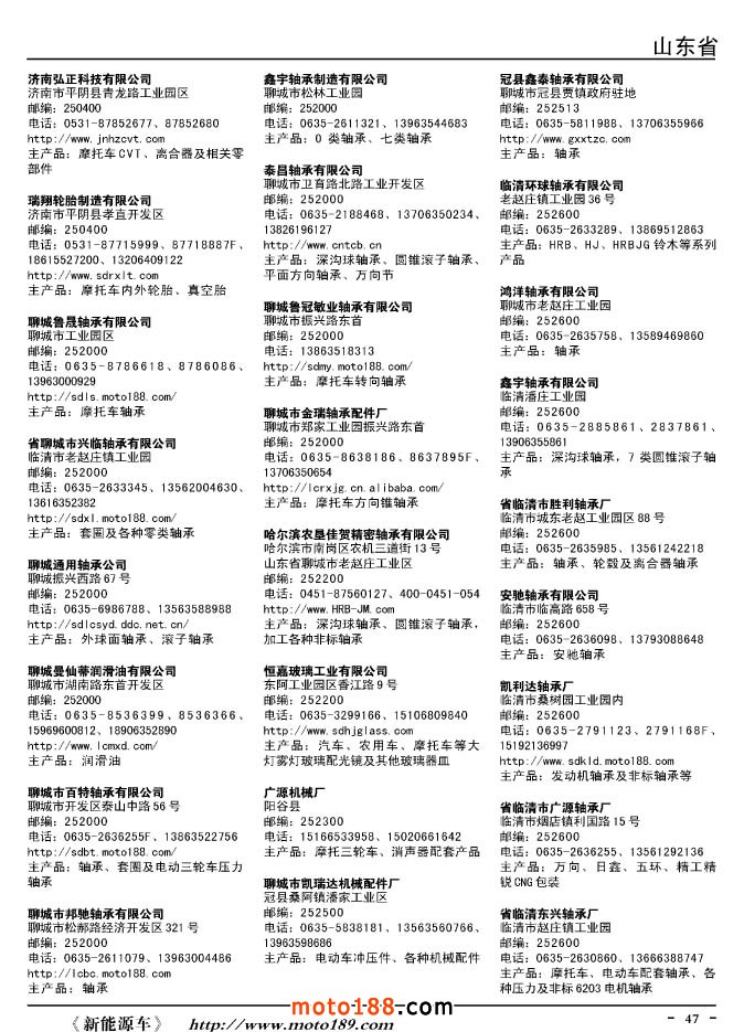 這兩年行業(yè)調(diào)整力度非常大,為了確保我們提供的信息準確性,我們本著寧缺毋濫的原則,不去圖虛的數(shù)量。目前摩托車與配件行業(yè)的不少經(jīng)銷商是跨行業(yè)經(jīng)營的,所以我們在本書中增加了部分摩托車整車廠、電動車生產(chǎn)廠、機動三輪車制造廠。所選的這些企業(yè)都是這個行業(yè)具有影響力的品牌企業(yè),是為了大家在使用這本書時,獲取相關(guān)的延伸產(chǎn)業(yè)更多的實用信息。
