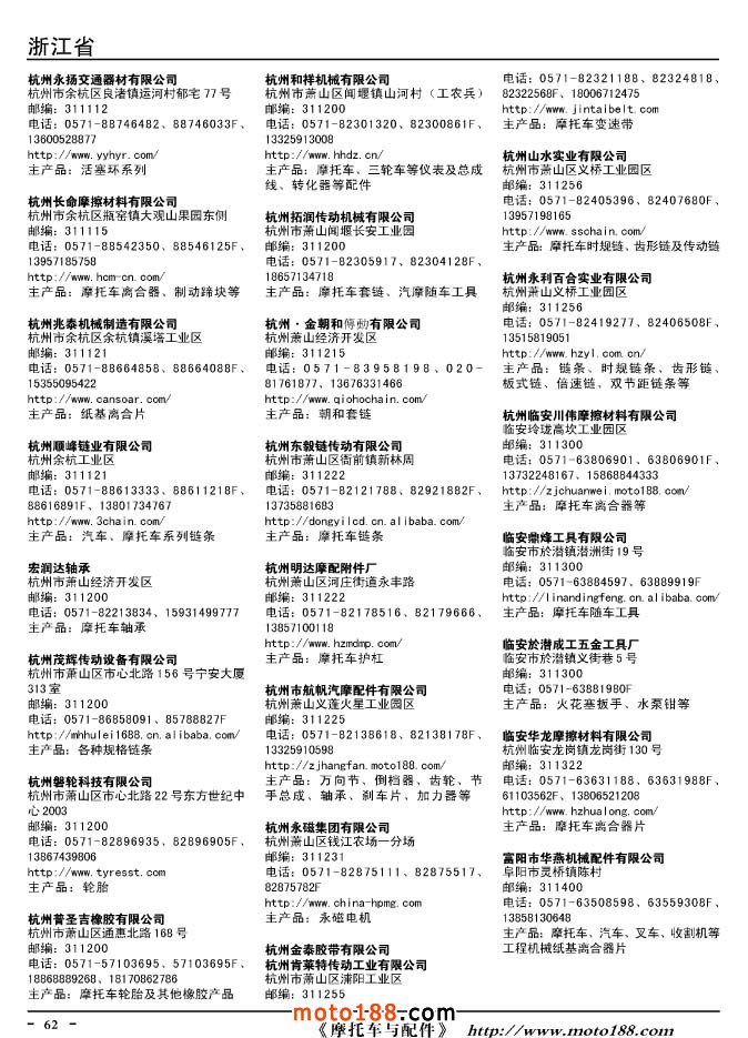 這兩年行業調整力度非常大,為了確保我們提供的信息準確性,我們本著寧缺毋濫的原則,不去圖虛的數量。目前摩托車與配件行業的不少經銷商是跨行業經營的,所以我們在本書中增加了部分摩托車整車廠、電動車生產廠、機動三輪車制造廠。所選的這些企業都是這個行業具有影響力的品牌企業,是為了大家在使用這本書時,獲取相關的延伸產業更多的實用信息。