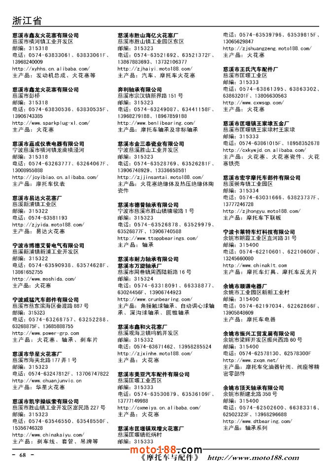 這兩年行業(yè)調(diào)整力度非常大,為了確保我們提供的信息準(zhǔn)確性,我們本著寧缺毋濫的原則,不去圖虛的數(shù)量。目前摩托車與配件行業(yè)的不少經(jīng)銷商是跨行業(yè)經(jīng)營的,所以我們在本書中增加了部分摩托車整車廠、電動車生產(chǎn)廠、機動三輪車制造廠。所選的這些企業(yè)都是這個行業(yè)具有影響力的品牌企業(yè),是為了大家在使用這本書時,獲取相關(guān)的延伸產(chǎn)業(yè)更多的實用信息。