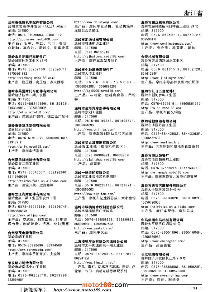 這兩年行業調整力度非常大,為了確保我們提供的信息準確性,我們本著寧缺毋濫的原則,不去圖虛的數量。目前摩托車與配件行業的不少經銷商是跨行業經營的,所以我們在本書中增加了部分摩托車整車廠、電動車生產廠、機動三輪車制造廠。所選的這些企業都是這個行業具有影響力的品牌企業,是為了大家在使用這本書時,獲取相關的延伸產業更多的實用信息。