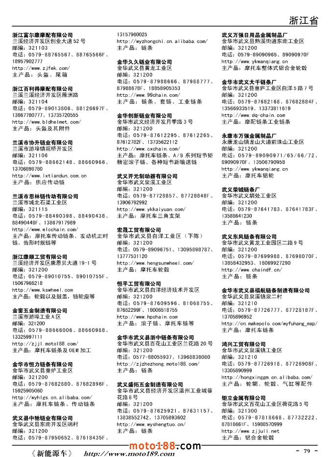 這兩年行業(yè)調(diào)整力度非常大,為了確保我們提供的信息準(zhǔn)確性,我們本著寧缺毋濫的原則,不去圖虛的數(shù)量。目前摩托車與配件行業(yè)的不少經(jīng)銷商是跨行業(yè)經(jīng)營的,所以我們在本書中增加了部分摩托車整車廠、電動車生產(chǎn)廠、機(jī)動三輪車制造廠。所選的這些企業(yè)都是這個(gè)行業(yè)具有影響力的品牌企業(yè),是為了大家在使用這本書時(shí),獲取相關(guān)的延伸產(chǎn)業(yè)更多的實(shí)用信息。