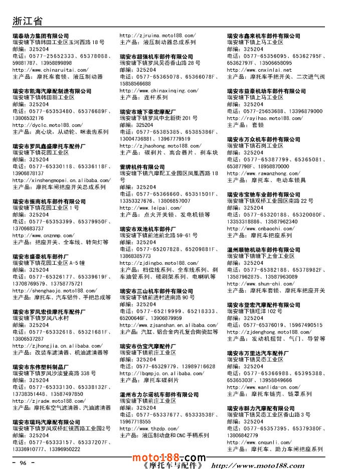 這兩年行業調整力度非常大,為了確保我們提供的信息準確性,我們本著寧缺毋濫的原則,不去圖虛的數量。目前摩托車與配件行業的不少經銷商是跨行業經營的,所以我們在本書中增加了部分摩托車整車廠、電動車生產廠、機動三輪車制造廠。所選的這些企業都是這個行業具有影響力的品牌企業,是為了大家在使用這本書時,獲取相關的延伸產業更多的實用信息。