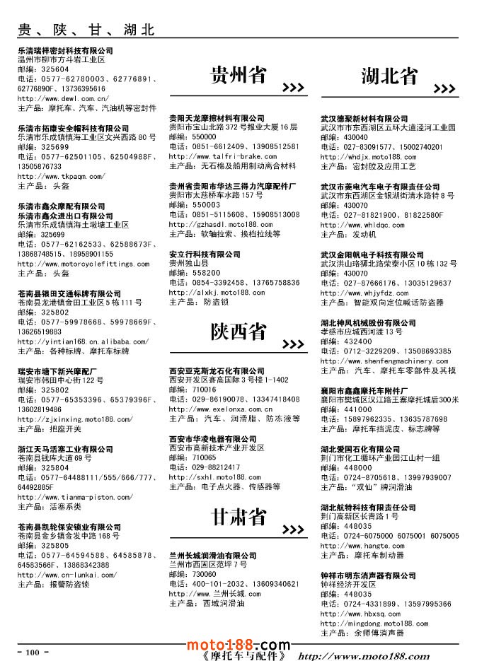 這兩年行業(yè)調(diào)整力度非常大,為了確保我們提供的信息準確性,我們本著寧缺毋濫的原則,不去圖虛的數(shù)量。目前摩托車與配件行業(yè)的不少經(jīng)銷商是跨行業(yè)經(jīng)營的,所以我們在本書中增加了部分摩托車整車廠、電動車生產(chǎn)廠、機動三輪車制造廠。所選的這些企業(yè)都是這個行業(yè)具有影響力的品牌企業(yè),是為了大家在使用這本書時,獲取相關(guān)的延伸產(chǎn)業(yè)更多的實用信息。