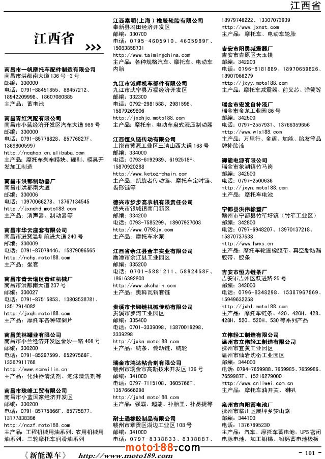 這兩年行業調整力度非常大,為了確保我們提供的信息準確性,我們本著寧缺毋濫的原則,不去圖虛的數量。目前摩托車與配件行業的不少經銷商是跨行業經營的,所以我們在本書中增加了部分摩托車整車廠、電動車生產廠、機動三輪車制造廠。所選的這些企業都是這個行業具有影響力的品牌企業,是為了大家在使用這本書時,獲取相關的延伸產業更多的實用信息。