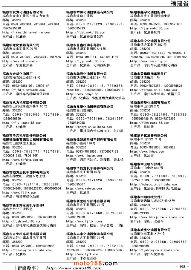 這兩年行業調整力度非常大,為了確保我們提供的信息準確性,我們本著寧缺毋濫的原則,不去圖虛的數量。目前摩托車與配件行業的不少經銷商是跨行業經營的,所以我們在本書中增加了部分摩托車整車廠、電動車生產廠、機動三輪車制造廠。所選的這些企業都是這個行業具有影響力的品牌企業,是為了大家在使用這本書時,獲取相關的延伸產業更多的實用信息。