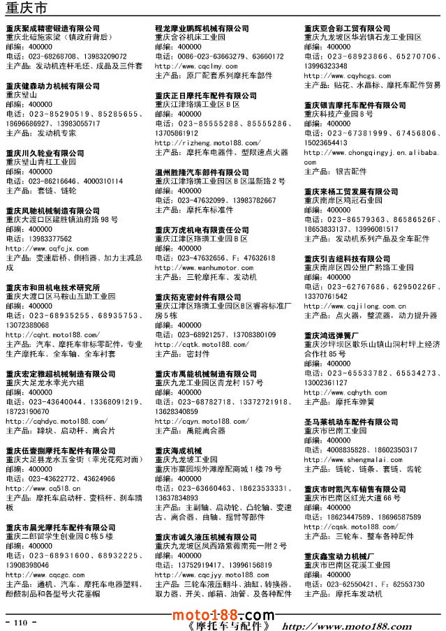 這兩年行業(yè)調(diào)整力度非常大,為了確保我們提供的信息準(zhǔn)確性,我們本著寧缺毋濫的原則,不去圖虛的數(shù)量。目前摩托車與配件行業(yè)的不少經(jīng)銷商是跨行業(yè)經(jīng)營的,所以我們在本書中增加了部分摩托車整車廠、電動車生產(chǎn)廠、機動三輪車制造廠。所選的這些企業(yè)都是這個行業(yè)具有影響力的品牌企業(yè),是為了大家在使用這本書時,獲取相關(guān)的延伸產(chǎn)業(yè)更多的實用信息。