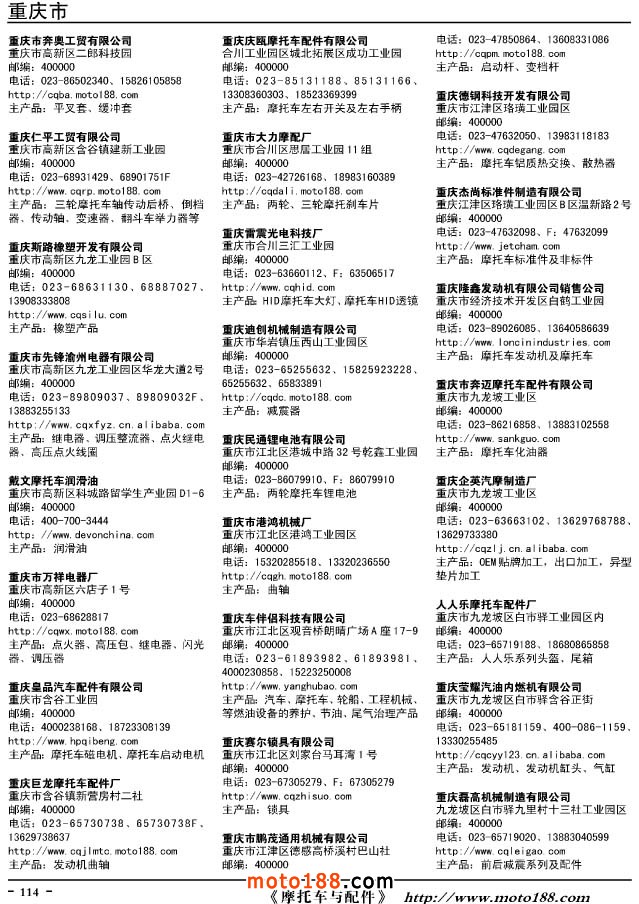 這兩年行業調整力度非常大,為了確保我們提供的信息準確性,我們本著寧缺毋濫的原則,不去圖虛的數量。目前摩托車與配件行業的不少經銷商是跨行業經營的,所以我們在本書中增加了部分摩托車整車廠、電動車生產廠、機動三輪車制造廠。所選的這些企業都是這個行業具有影響力的品牌企業,是為了大家在使用這本書時,獲取相關的延伸產業更多的實用信息。