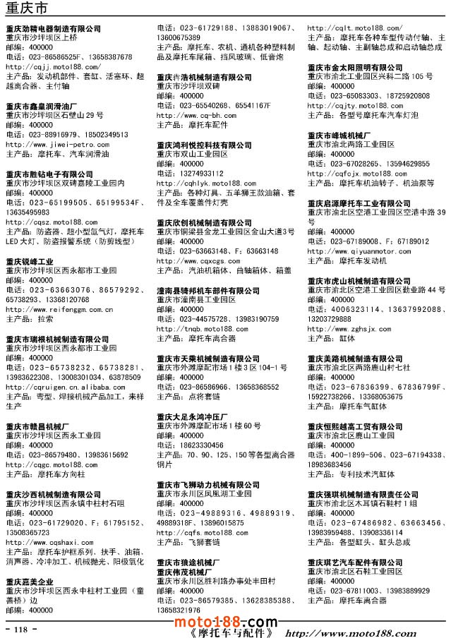 這兩年行業(yè)調(diào)整力度非常大,為了確保我們提供的信息準確性,我們本著寧缺毋濫的原則,不去圖虛的數(shù)量。目前摩托車與配件行業(yè)的不少經(jīng)銷商是跨行業(yè)經(jīng)營的,所以我們在本書中增加了部分摩托車整車廠、電動車生產(chǎn)廠、機動三輪車制造廠。所選的這些企業(yè)都是這個行業(yè)具有影響力的品牌企業(yè),是為了大家在使用這本書時,獲取相關(guān)的延伸產(chǎn)業(yè)更多的實用信息。