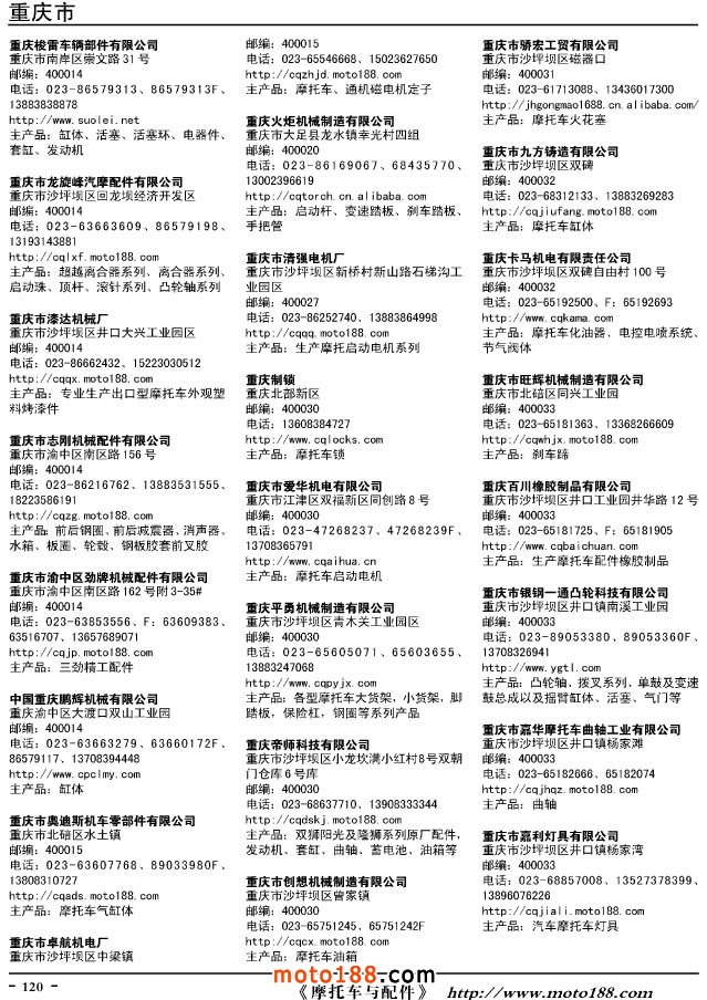 這兩年行業調整力度非常大,為了確保我們提供的信息準確性,我們本著寧缺毋濫的原則,不去圖虛的數量。目前摩托車與配件行業的不少經銷商是跨行業經營的,所以我們在本書中增加了部分摩托車整車廠、電動車生產廠、機動三輪車制造廠。所選的這些企業都是這個行業具有影響力的品牌企業,是為了大家在使用這本書時,獲取相關的延伸產業更多的實用信息。