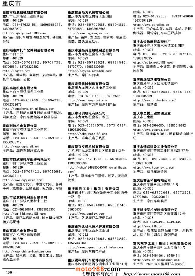 這兩年行業調整力度非常大,為了確保我們提供的信息準確性,我們本著寧缺毋濫的原則,不去圖虛的數量。目前摩托車與配件行業的不少經銷商是跨行業經營的,所以我們在本書中增加了部分摩托車整車廠、電動車生產廠、機動三輪車制造廠。所選的這些企業都是這個行業具有影響力的品牌企業,是為了大家在使用這本書時,獲取相關的延伸產業更多的實用信息。